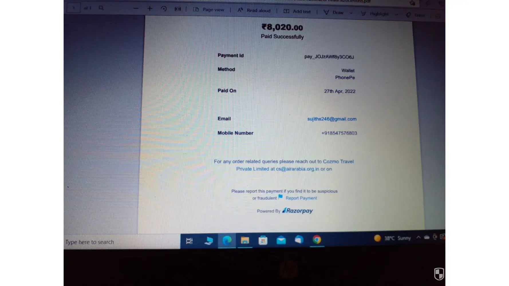 The Next day I called the same number and asked them to send me the payment link. They sent me a payment link of 8020 indian rupees. I didn't make the payment and I called again for confirmation. Then they told me that it's only the price difference and there are no extra service charges or anything included.