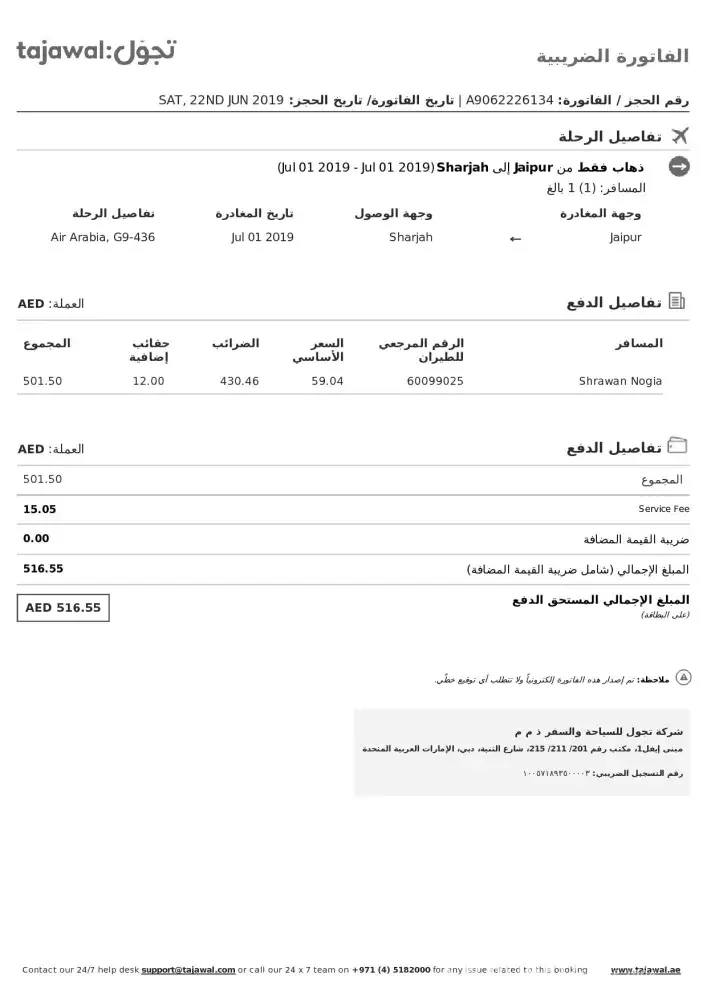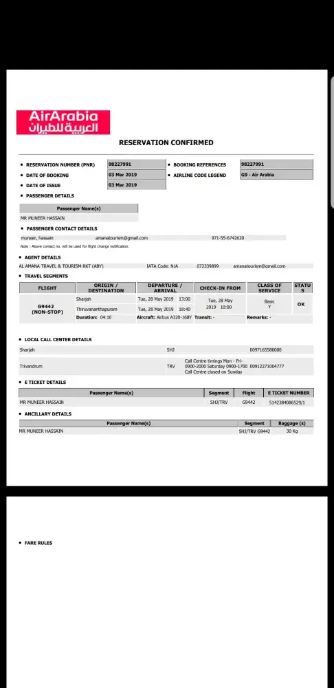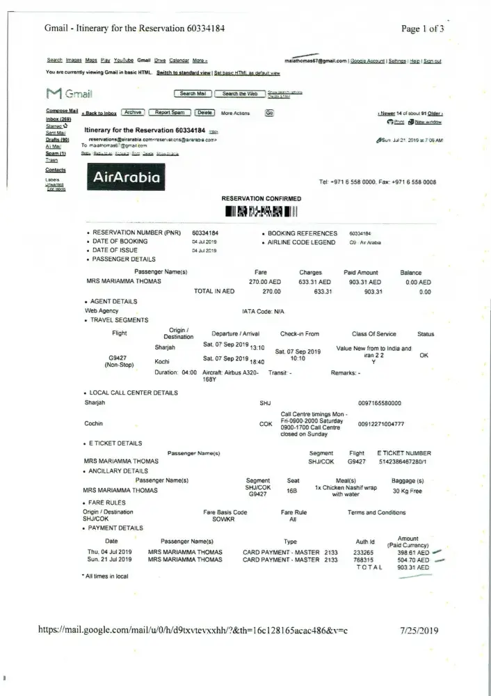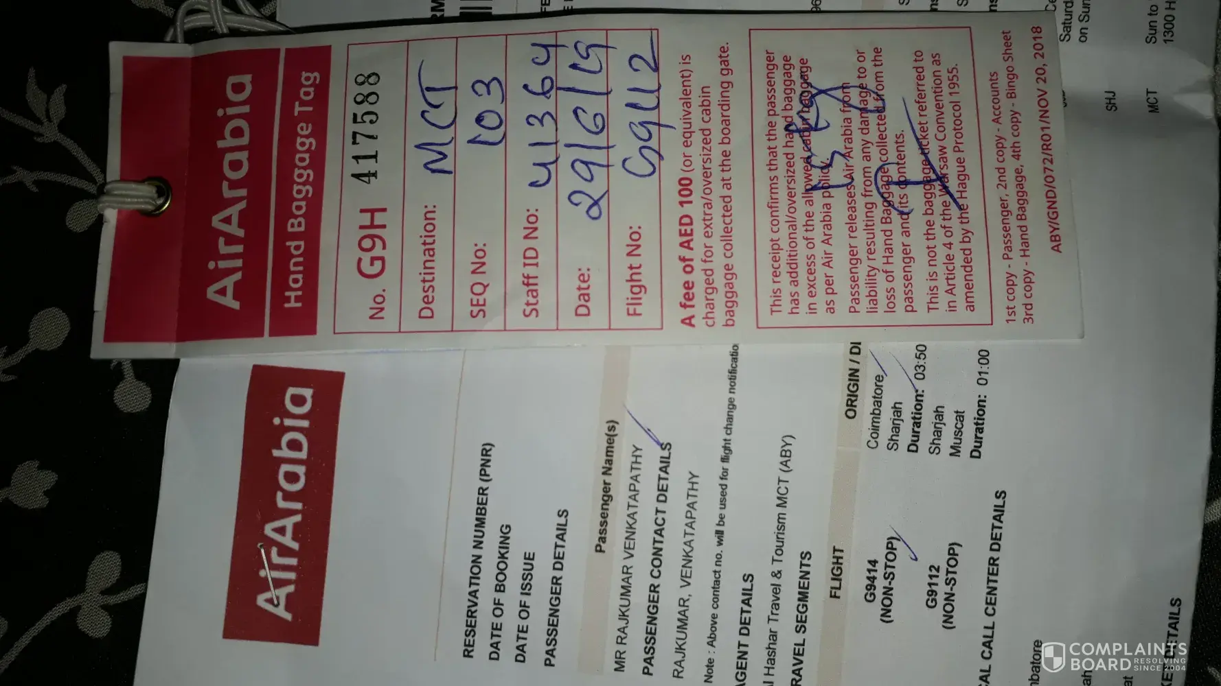 I have travelled from coimbatore to Muscat via sharjah on 29.6.19 by G9414/ G9112.
