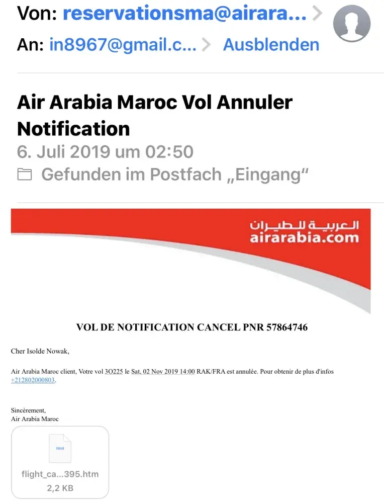 We booked and paid 4 tickets from Frankfurt to Marrakech and back for October - November 2019. The airline cancelled the flights beginning of July 2019. Up to now we did not get our tickets refunded. Air Arabia does not respond emails, provides customers only with costly phone numbers and when we try to call they stop the call as soon as they hear what we want.