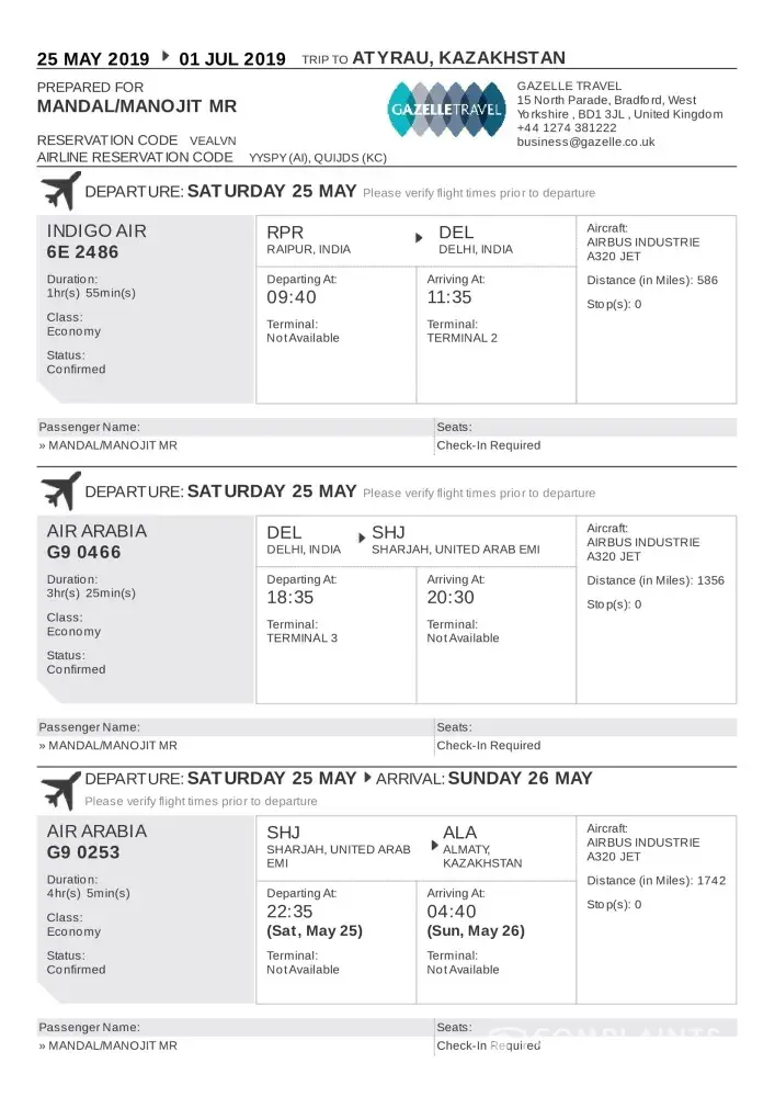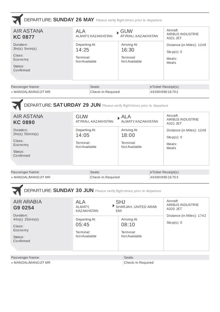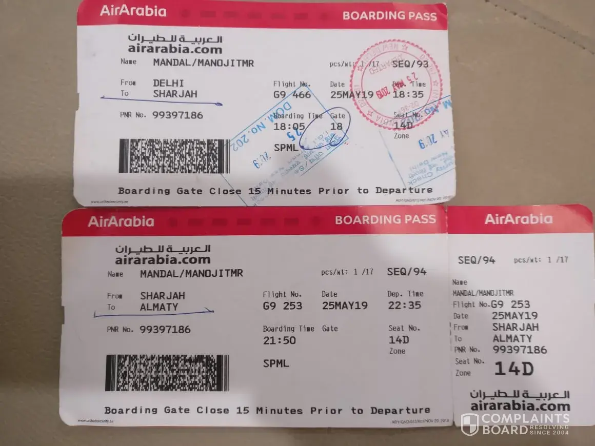 I had Air Arabia flight (G9 466)from India to Sharjah on 25th May 2019 at 18:35 from India transit at Sharjah Airport and further Air Arabia flight (G9 253) for Almaty at 22:35.