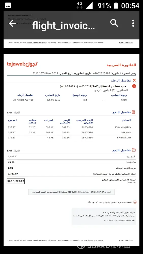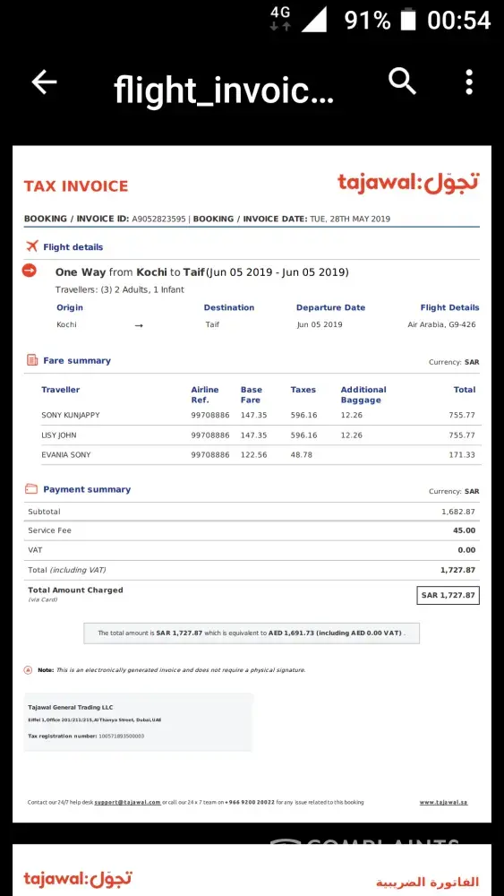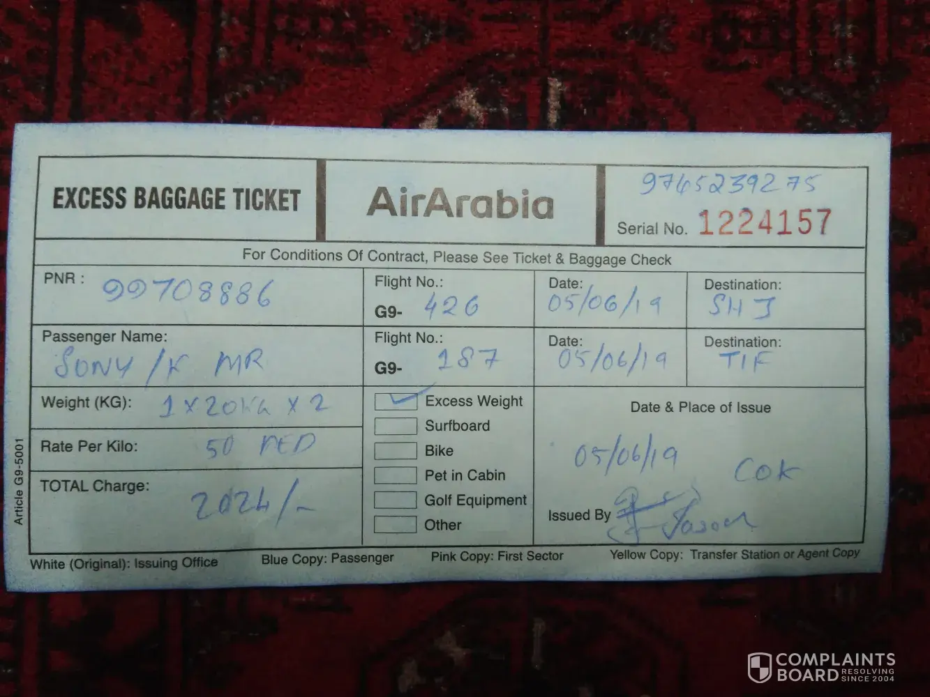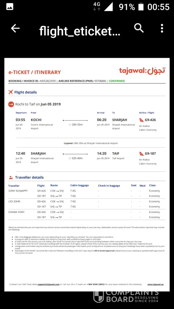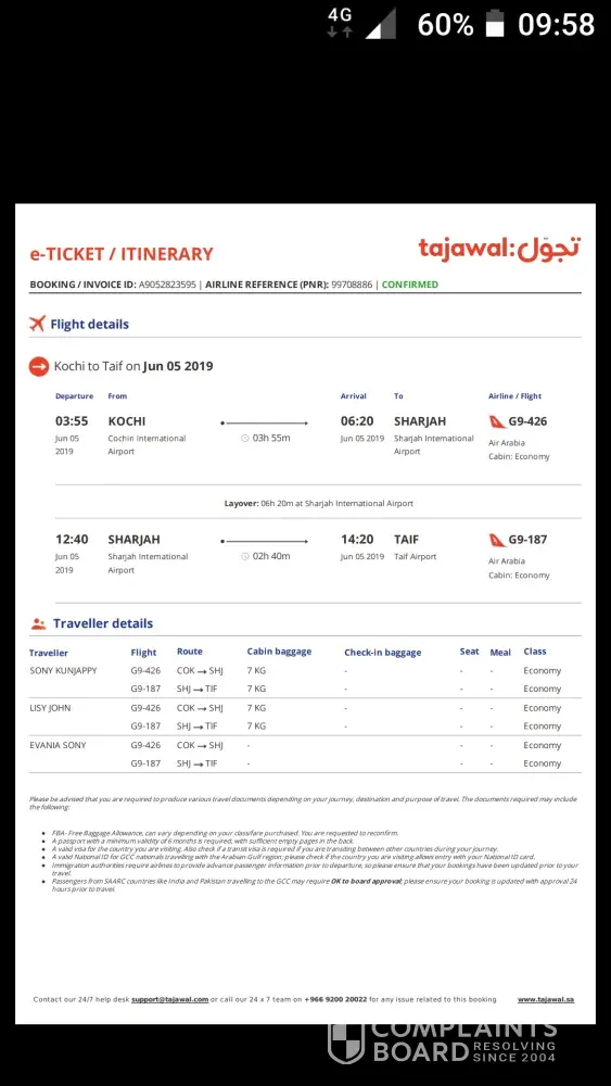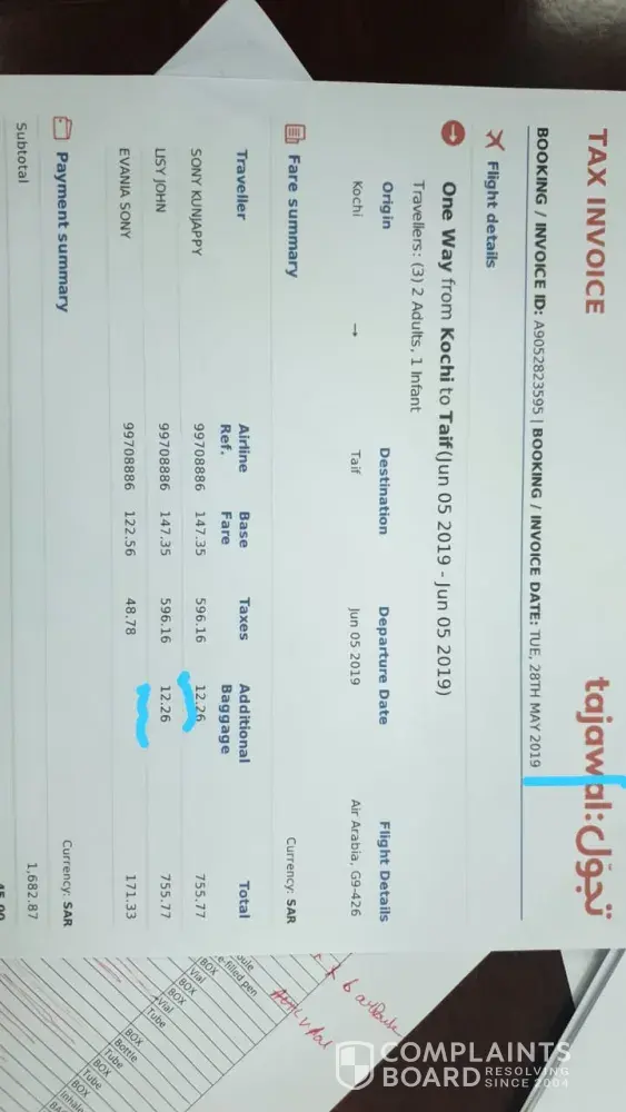 Yesterday morning( 05-06-2019)me and my wife with our daughter travelled from kochi -sharjah(G9-426) sharjah -taif (G9-187)PNR:99708886.while check in, the chech in counder officer told me there is no baggage included in the ticket. But i told him we paid for extrabaggage fee (30kg+30kg)while purchasing the ticket and shown him the bill. But he said it not shown in his syastem and he ask me to pay 1012+1012rupees for two bags (20kg+20kg)and for extra each kg i have to pay 1012rs. So i paid 2024rs. So i paid twice for the baggage. First one when i purchased my ticket and other while check in. And my remaining 20 kg left in kochin. What is your solution for this.? I am attaching the ticket and bill details. Extra baggage bill also. Please do the necessary action.