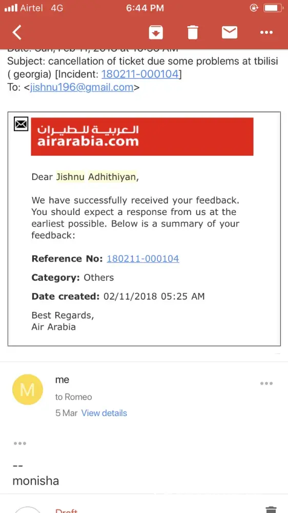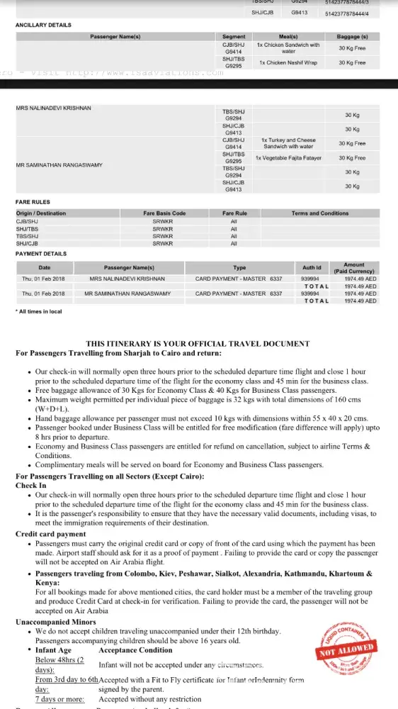 very cheep service in air arabia they doing cheeting services Dear customer don't take this company ticket .Beacuse my wife got very cheep Behaving this company staff