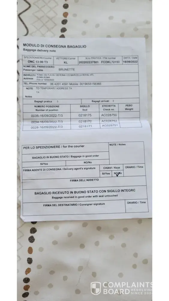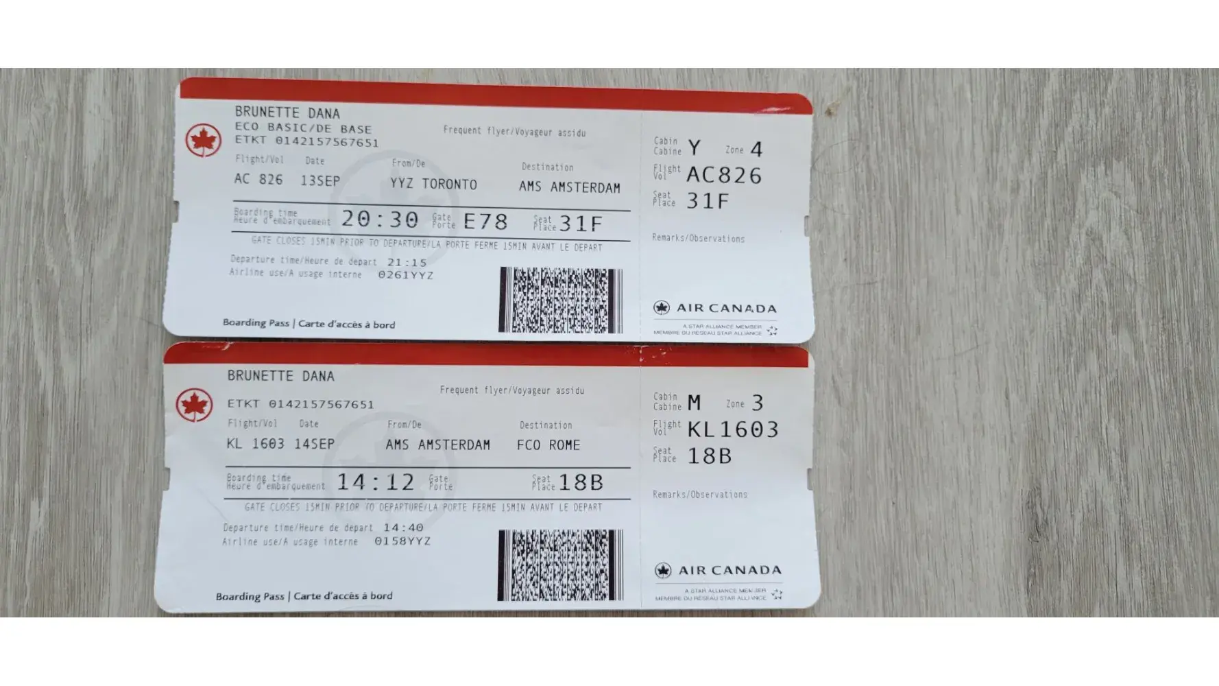 We were then rebooked on flight AC826 to amsterdam, then onto KL1603 to rome. We asked several times if our luggage would accompany us... and re were reassured several times that it would arrive in Rome safely. Well it didn't! The KLM guy at baggage looked it up and said the baggage was still in Toronto. We were on a tour so made us very nervous that we would get our luggage at all. We finally got out luggage three days later. You inconvenienced myself and my elderly parents.
