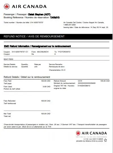 I recently received my Air Canada Covid19 refund of $2, 749.88 for my booking ref TARMY3 for my flights booked Feb 2020. However, my total refund did not include my seat upgrades of $400 and I hope you can remedy this asap.