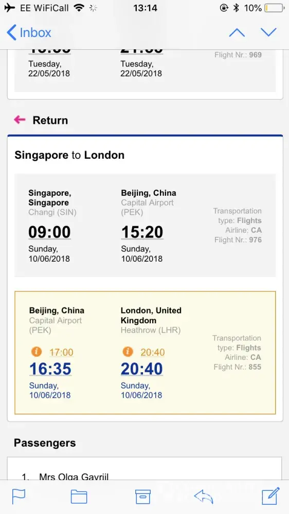 I hope you investigate this matter so that it would not happen to anyone again as this incident had dampen our impression of Air China tremendously. Our experience with you has so far been very good but it just take an unhappy staff of your company to ruin it.