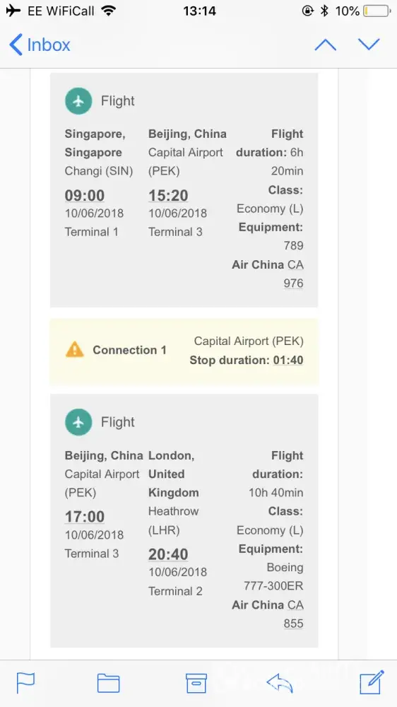 The exact same situation happened to my mother in-law and brother in-law on May 22nd with the exact same flights and had to spend a night in Beijing to catch a flight the next morning. Can you explain why do you make connecting flights when nobody can even make them? This is ridiculous and the customer service that Air China provides is way below standard and is a joke.