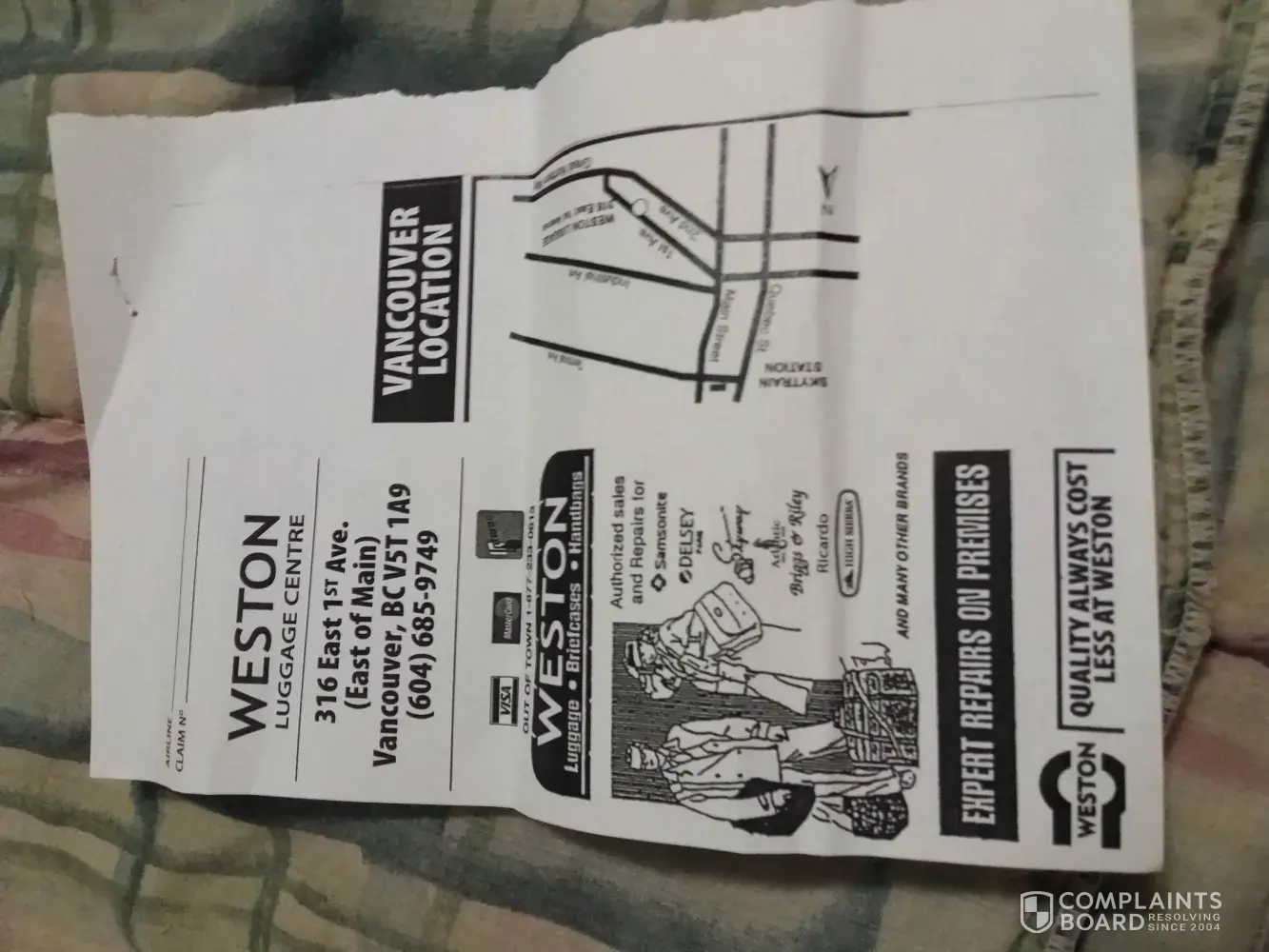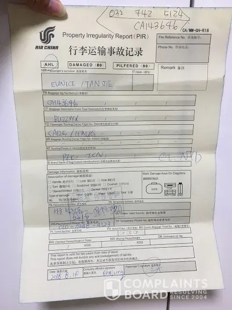 I immediately contacted the complaints desk and filled in the PIR (Property Irregularity Report) form, a copy of which is added to this letter.