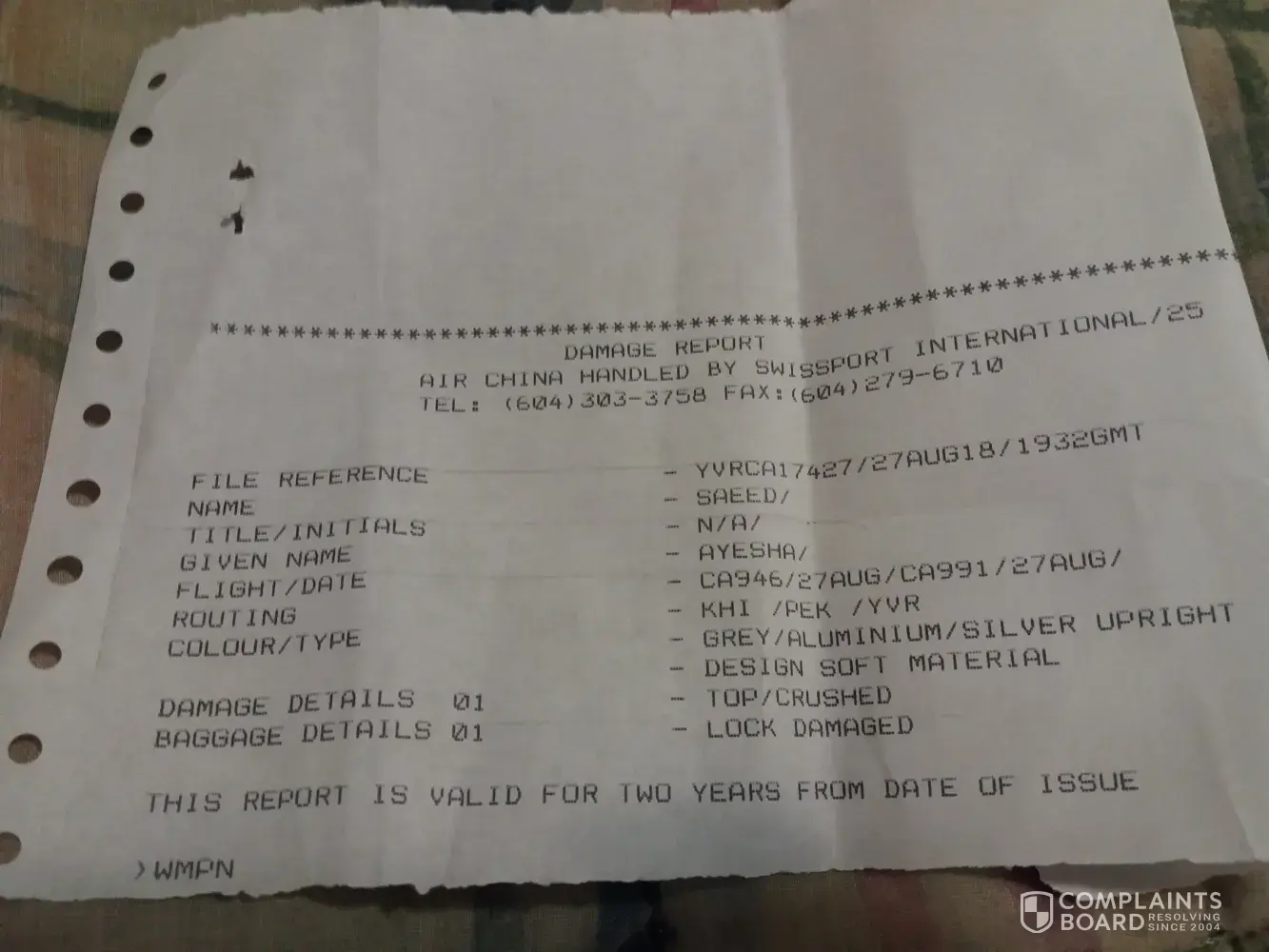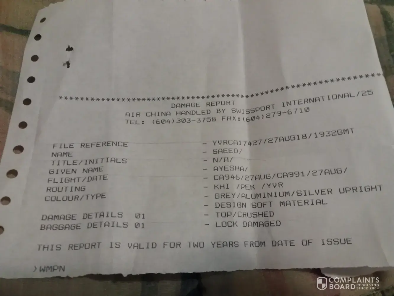 Yesterday I came back to Vancouver from a long connecting Air China flight CA946/27Aug/CA991/27Aug from Karachi - Peking-Vancouver, my overall flight experience was satisfactory but after a long flight one of my luggage was damaged. The lock and the zipper ends are gone and there are some obvious signs of damage. I reported at the Air china desk, the agent inspected the luggage and filed the complaint, he gave me the repair shop address which is located far from my place of residence, I have to spend more money going to the shop, dropping the luggage and going another time to pick it up. As I work in Surrey, British Columbia, it is very hard for me to take it to Vancouver, when I asked the agent about missing contents from inside, he said I have to go to the police and they can help me find my lost things, it does not make sense to me. Luckily, nothing is missing from inside the bag, but why it was opened and then damaged, there should be investigation about this matter and I should be informed about it, I would request Air China to make the repair process easy for me either by reimbursing the money or sending me another suitcase of same value. I am attaching the necessary details about the damage.