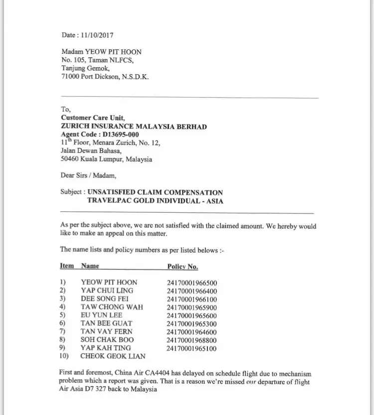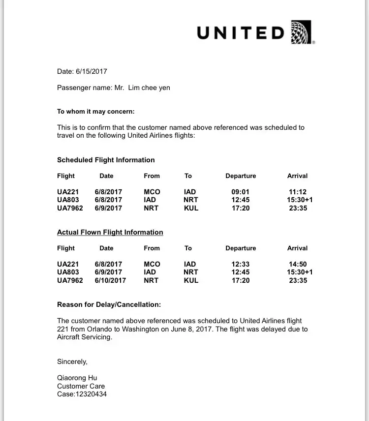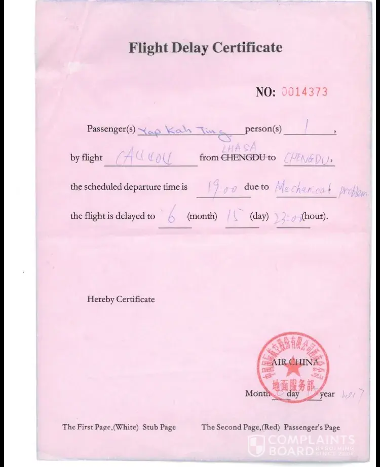 As regards as mentioned above, we would like to request a formal letter (sample as attach) about the flight CA4404 delay on 15-Jun-2017, chasa to chendu due to technical problem. Tha delaying cause our team miss air asia flight to Malaysia, hence we need to repurchase new ticket but Zurich insurance refused the claim without any formal letter from Air China.