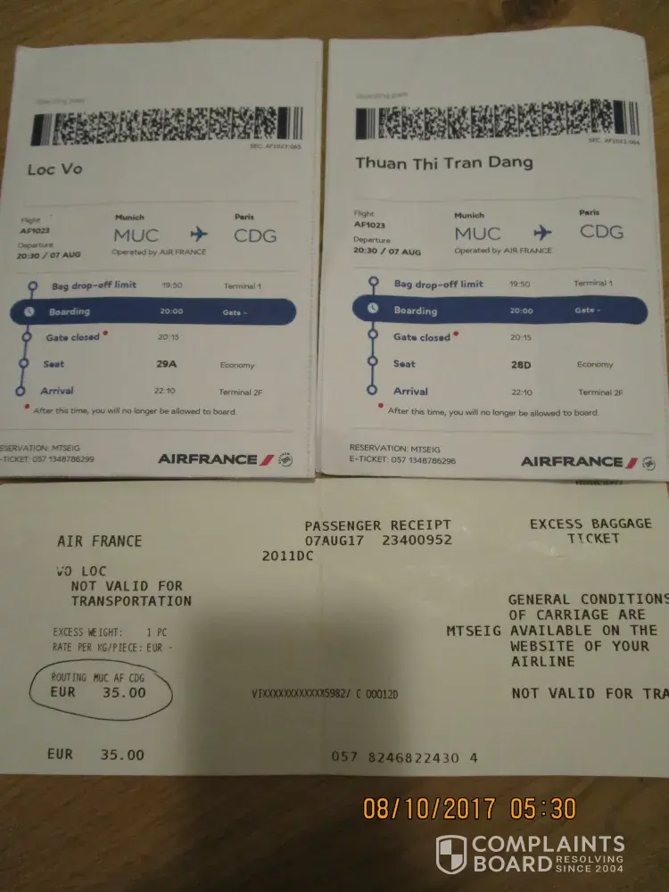 When arrived at the Munich Airport and check in the baggage, I mistakenly checked in my baggage under the name of Loc Vo, instead of Thuan Thi Tran Dang and was charged an additional 35.0 Euro; Passenger Receipt 07AUG17 - 2340092.