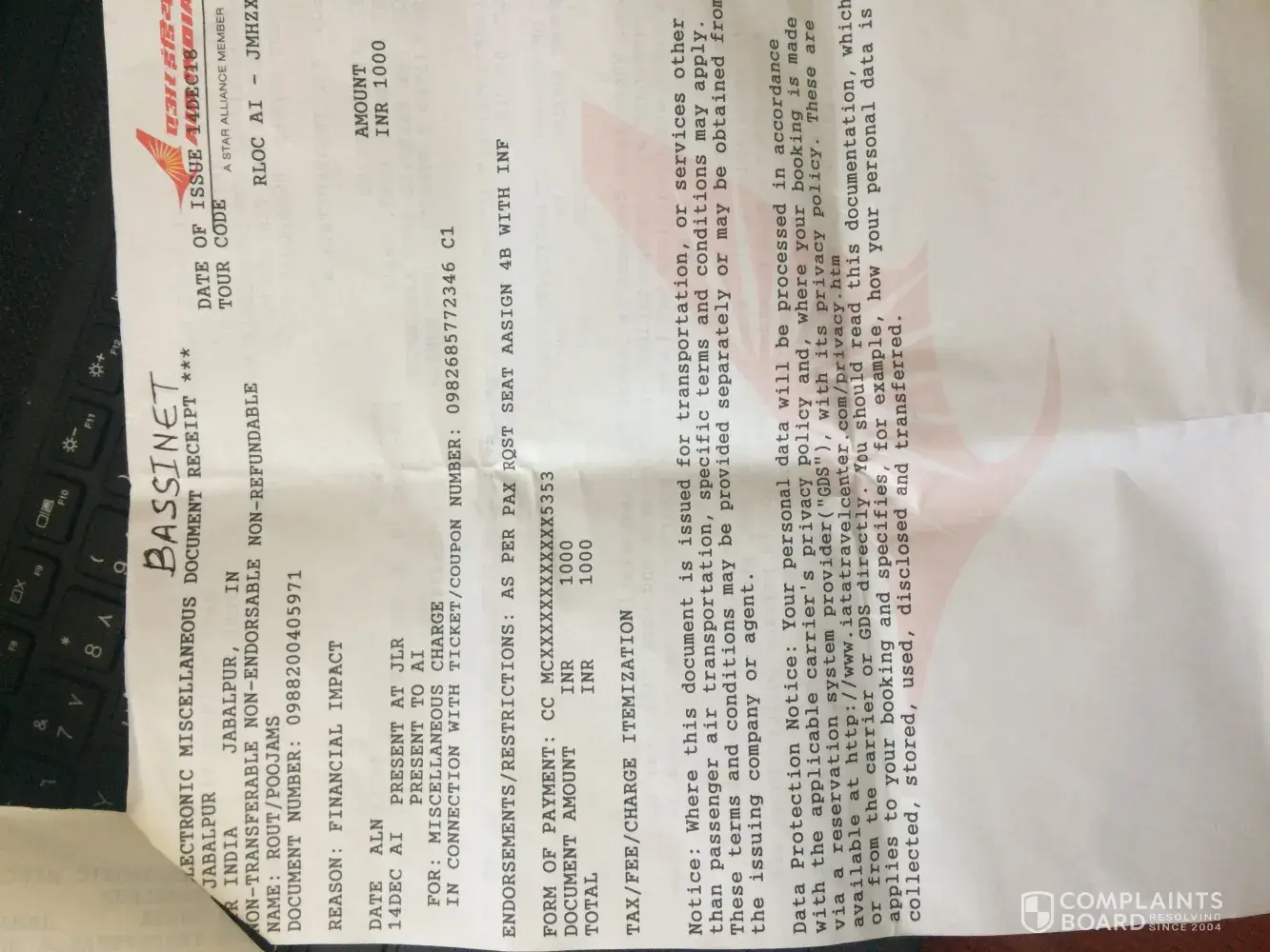 Hi i booked flight for 20 dec 2018 from air india counter jabalpur, madhya pradesh requested to book bessinet fro my 6 month old baby, I paid 1000 RS charges for the baby BASSINET FACILITY. But when i reached to flight air hostess from me there is no bassinet facility for these flight.