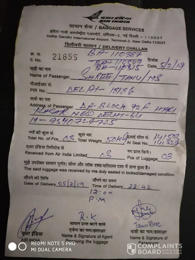 After 3 days of anxiety, she received a call from Air India on 5th of Feb, 19 & was informed about tracing of baggage and subsequently the baggage was delivered at her temporary address in India only on 5th of Feb at 22:42 PM., Copy enclosed at Annexure-B.