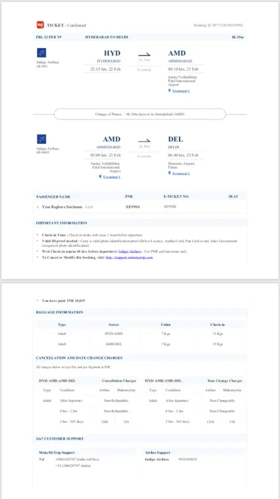 I had booked a ticket on flight AI 776 from Bhubaneswar to Hyderabad on 17th February 2019 and connecting that on AI 9550 from Hyderabad to Coimbatore on the same day. On 9th February 2019 or so, I received a message that the flight AI 9550 from Hyderabad to Coimbatore on 17th February 2019 is cancelled. So I had to book an alternate flight to Kochi to come to Kerala.