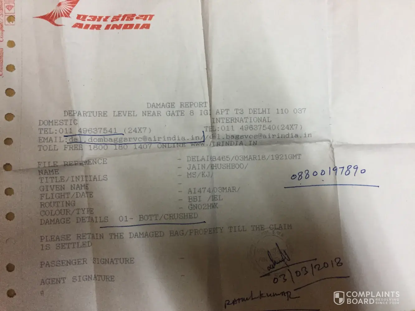 On my travel to Delhi from Bhubaneswar in flight no. AI 474 on Date 03/03/2018 my baggage was broken due to mishandle and I received a broken baggage at Delhi . So I registered a complain at Air India office at Gate no.8 T3 in Delhi. When I registered complain I was told to follow up Air India after a week and when I called up after a week after many try they answered my call and told me to talk with there vendor who is in Delhi on calling them they say me to bring the broken luggage at there Delhi office. Sir I live in Bhubaneswar how will I now bring broken luggage at Delhi now, So I contacted Air India again they told me they will transfer this case to Bhubaneswar and on continuous mail and call they are not responding and on calling up they put phone aside and on mails they are not replying intensely . This a very bad experience I am facing please help me. I am providing the complaint