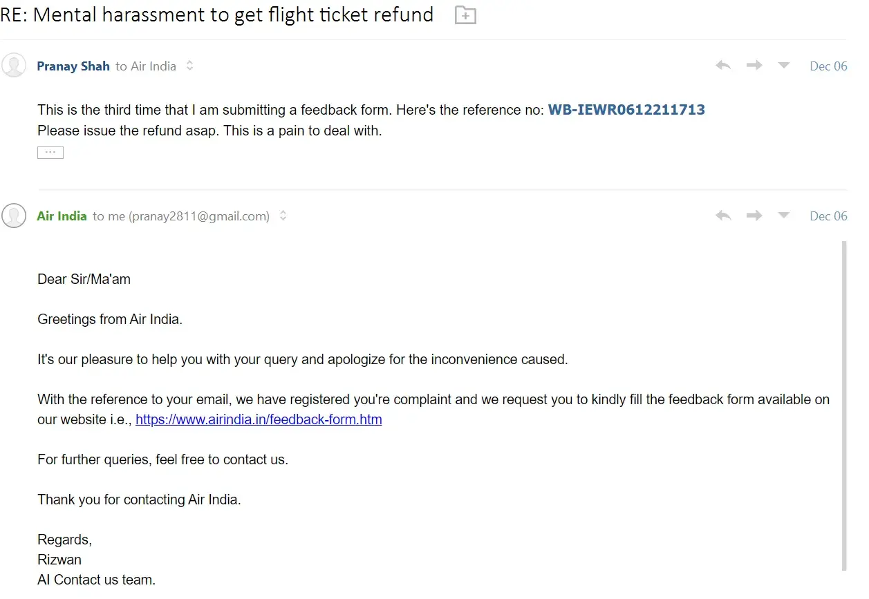 I have sent 3 emails to [protected]@airindia.com and [protected]@airindia.com and no response.