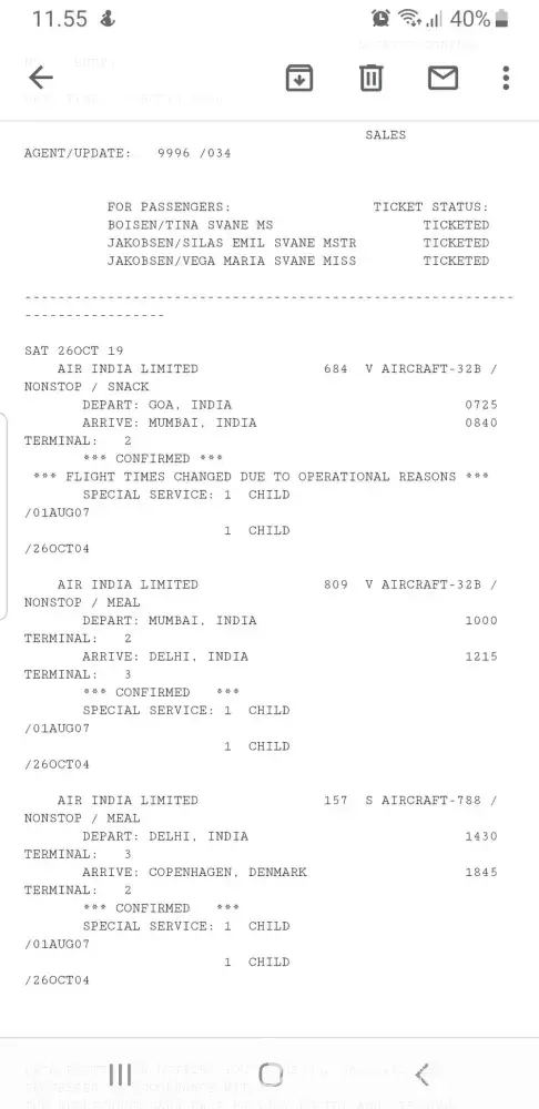The 27th of October me and my children was on AI157 from Delhi to Copenhagen. The flight was originally scheldued to land in Copenhagen at 18:45 (see attachments), but a delay caused we didn´t land in Copenhagen before 20:27.