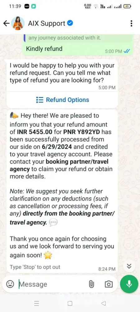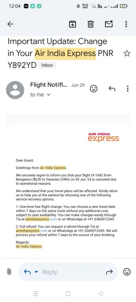 On 30/6/2024 fight which was scheduled from Bangalore to Varanasi was cancelled by air india express due to operational reasons on 28/6/24.. hence forth i requested them to refund my full amount on 28/6/2024.