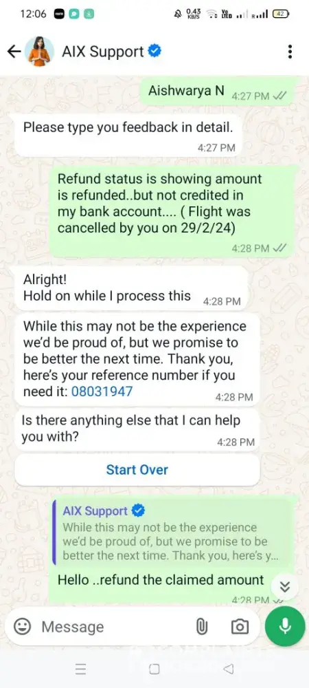 On 07 Oct 2024 I wanted to Add 20 kg Additional Baggage more in the Add on it was showing 2040 Rupees. I paid 2040 Rupees. But surprisingly the amount only charged but additional Baggage was not added