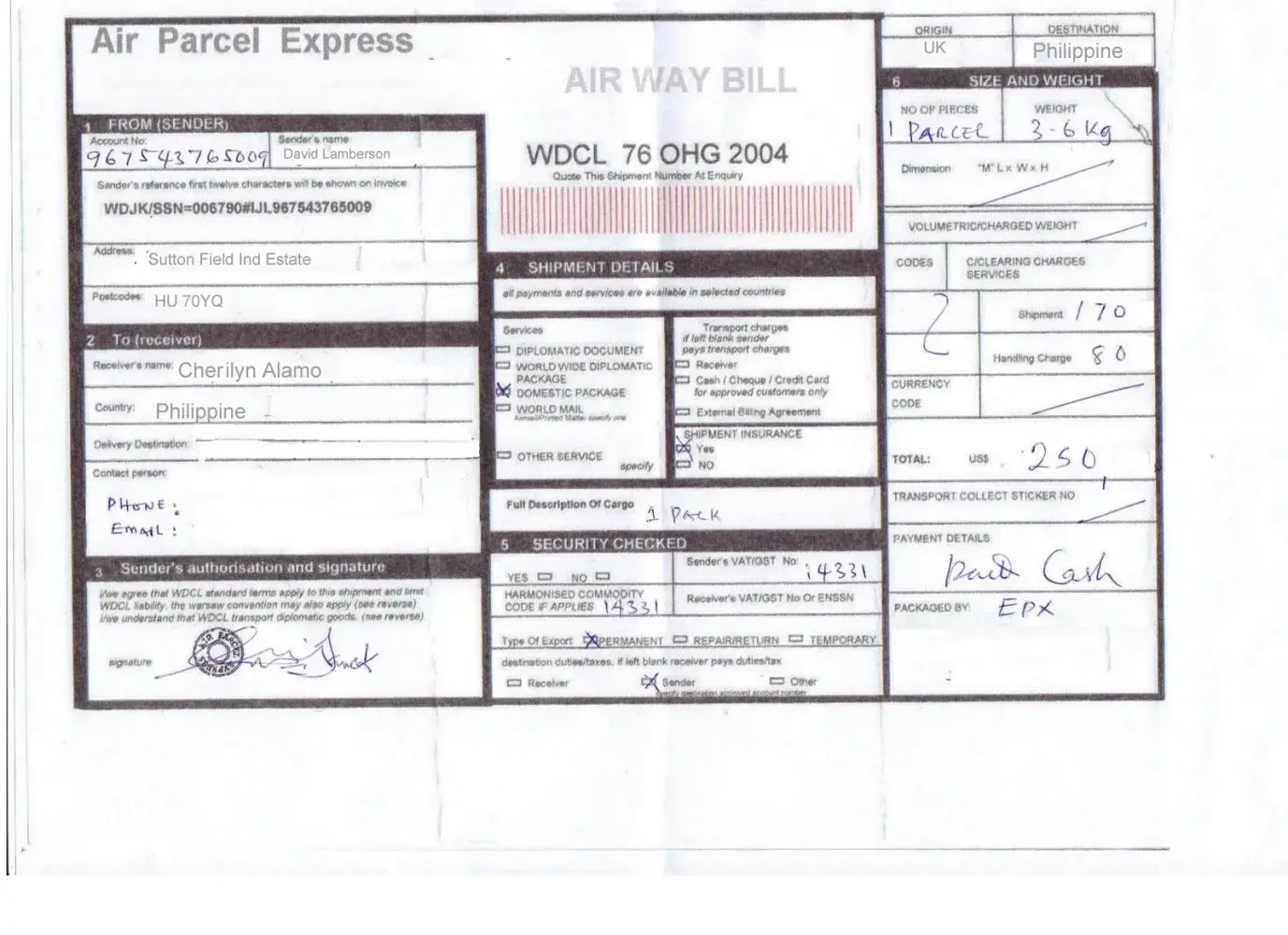 I met a guy from internations and he began talking sweet things to me. He said, he's a structural engineer from lancaster texas usa, a widow for a year because his wife died from cancer, and he has a 2 year old daughter. After 3 days he said he'll be working for an offshore site in uk. When he arrived there, he said he's going to the mall to buy some stuff for himself and for his child which is left. He also bought something for me like roses, chocolates, pairs of jewelries, blah, blah, blah. He said he's going to send me the parcel the next day and I will receive it after 2 working days. Then, after 2 days the courier company contacted me and here's what they say.