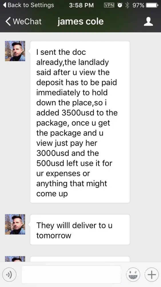 I was contacted through InterNations by a man named James Cole. He claimed to be from Scotland but was living in California. He asked if I would like to be friends as he was coming to Beijing soon and would be lonely. I added him on WeChat and we began to talk for a few days. He then asked me if I would go look at an apartment for him because he didn't have any friends in Beijing and wanted to have some knowledge of what the apartment was like before he accepted it. I thought this was a little strange but I agreed because I'm a nice person. He told me he worked on an oil rig near California and would be offshore for the next two weeks so he might be hard to reach. The next day he told me that he would send me a package with $3500 US dollars, $3000 would be for the downpayment on the apartment and the other $500 would be for any expenses that might occur. He asked for my address so I gave him my work address. He also said the contract would be in the package. He said he would send it overnight and I would receive it the following day and to be ready for a phone call from the shipping company to confirm delivery of the package. The next morning, I received a phone call and e-mail from World Air Courier and Mr. Page Kerry with the following message: