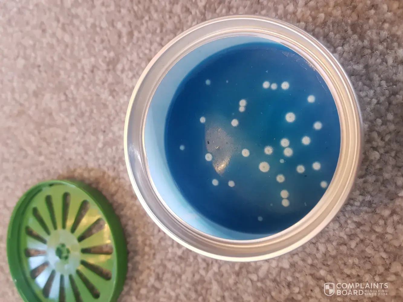 Bought the scented gel from asda 3 weeks ago and just noticed that there is white spots through the top vent.i opened it it looks like white mould? Not happy as this has been in my bedroom! I've took pictures and have looked on the bottom and it's out of date ! Which shouldn't have been sold