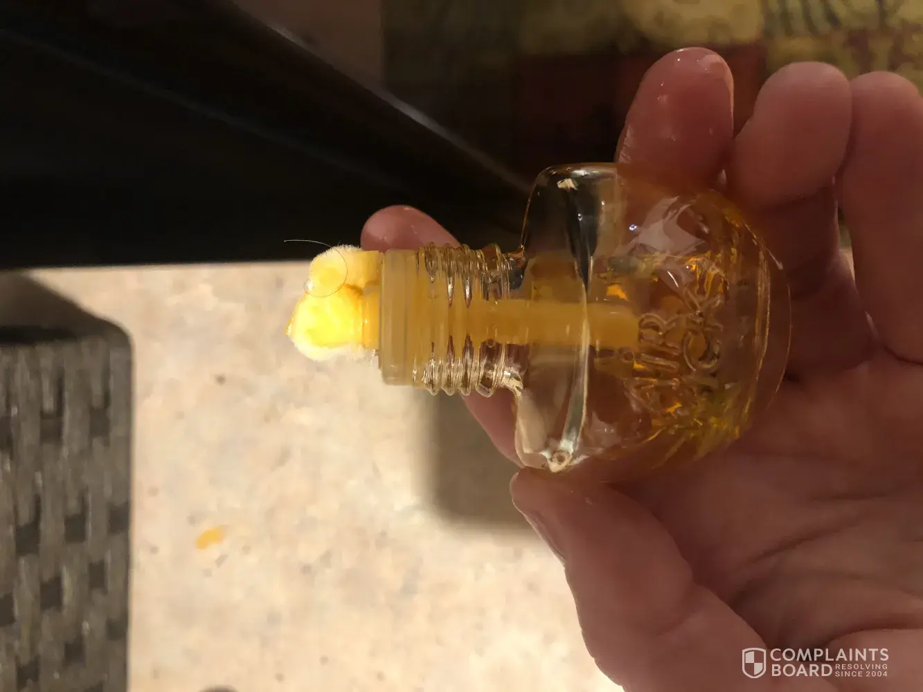 The warmer fell on the Side on a varnished wood floor. By the time I saw it, the bottle had leak and the oil was dry, making a 1 1/2-2 inches orange stain on the floor.