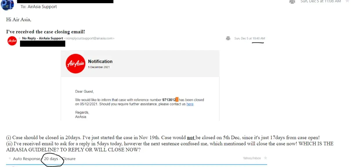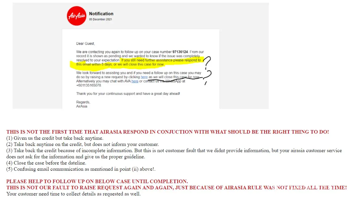 (3) their poor management. I've follow the rule to raise new case [protected]) through Airasia complaint system, however, they feedback that will contact us through another case [protected]), and will close the new case [protected]). There is no way that Airasia could contact us, since both the case has been closed.
