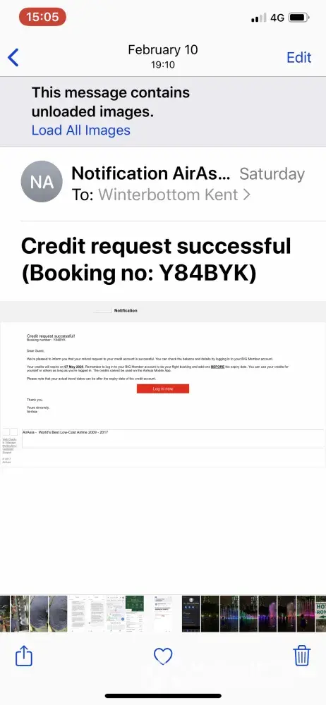 On February 9 we receive the credit on my air Asia account we subsequently tried to book the return flight with the credit but we're unable to complete transaction without my wife's credit card we went to the air Asia centre in KL Sentral in Kuala Lumpur we explained what was going on and how we cannot complete the transaction without the credit card number the agent there said it was a non-issue and that the credit card would not be billed anything as we had a credit on the account. The flight was booked without incident.
