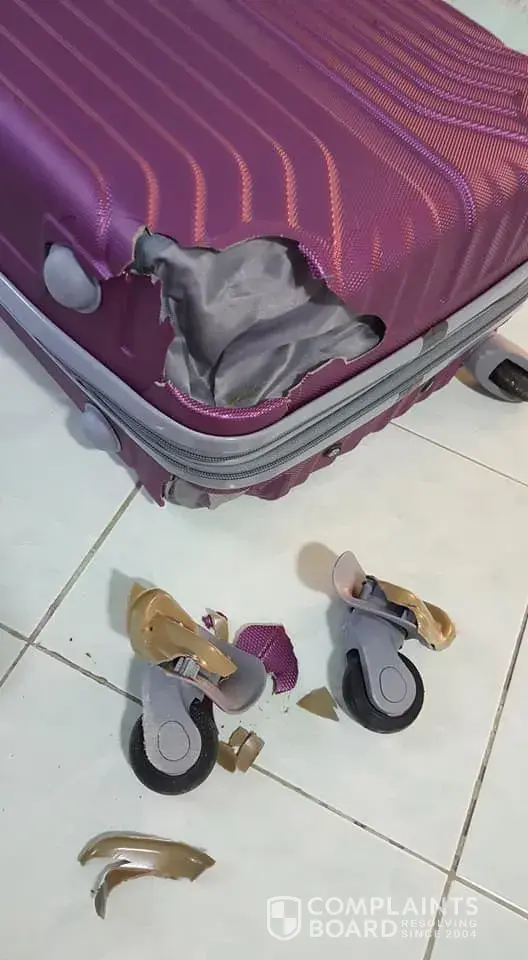 On arrival and luggage claim, we found that one of the wheels of my Carlton suitcase was broken due to luggage mishandling. (Photos attached).