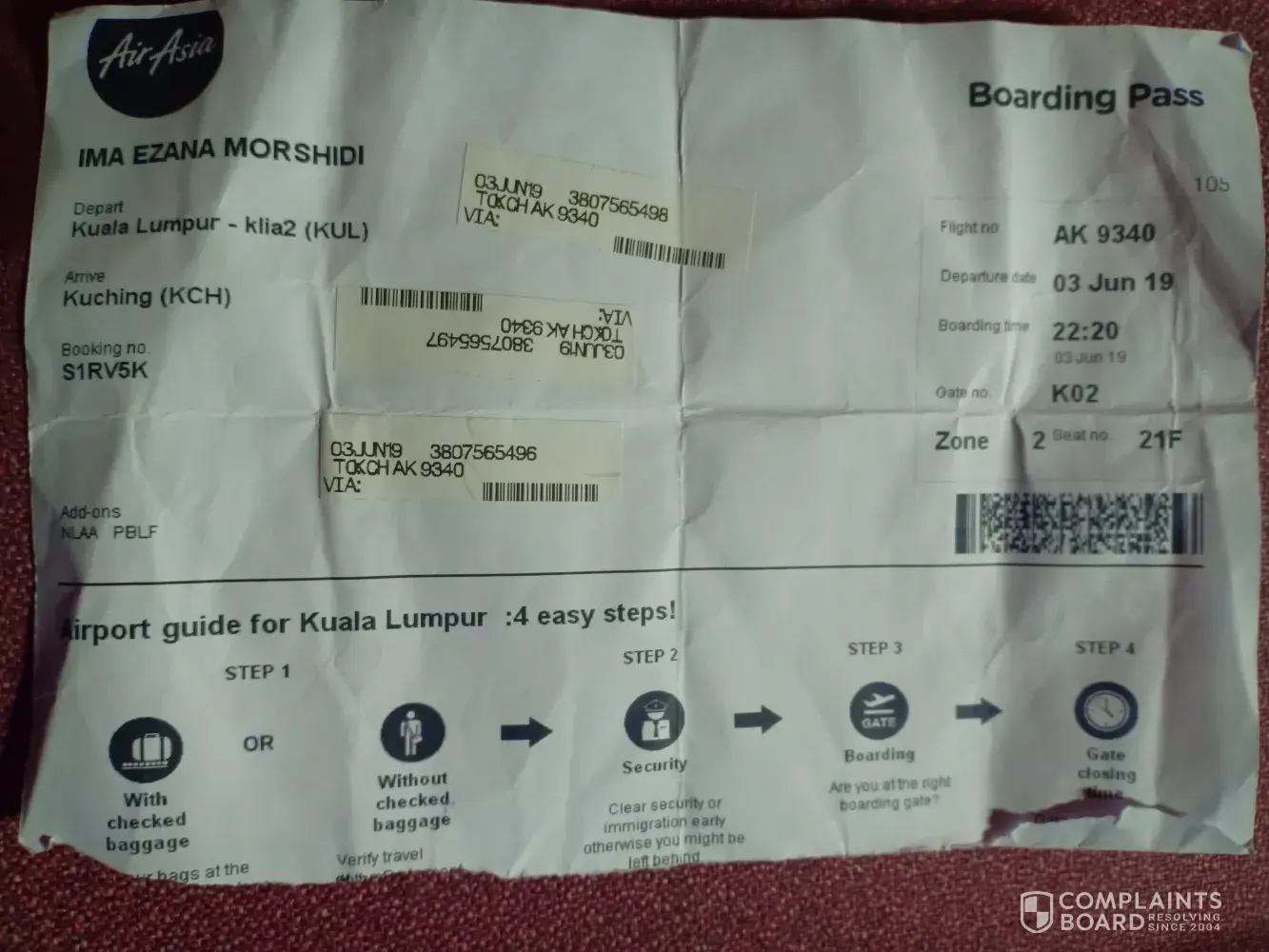 Note: Upon arrival, I spoke to an AirAsia officer in charge of baggage (Shikin), and she saw the bag and took a picture of it. She then advised me to lodge a complaint about it online.