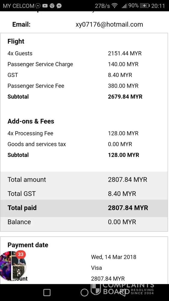 Because of no fault of mine, I have to buy another new ticket to Penang AK 6136 which cost me RM561.60 with my Australian Master card.