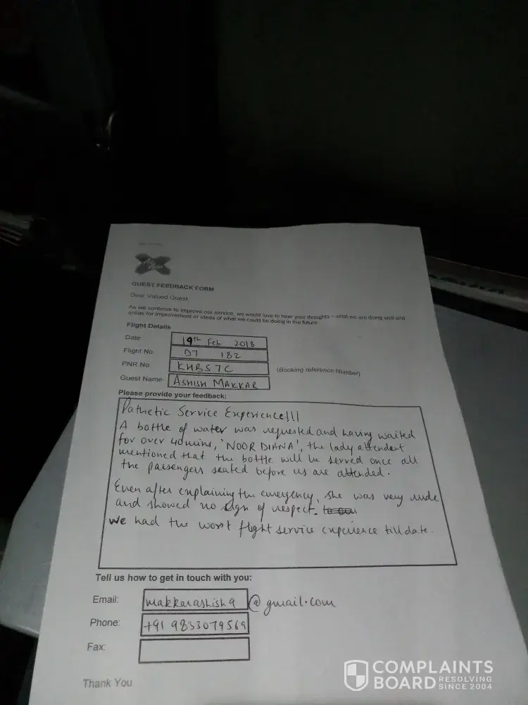 When we asked the lady about the feedback form, she showed no sign of respect and instead asked the other cabin crews to pass on the feedback form.