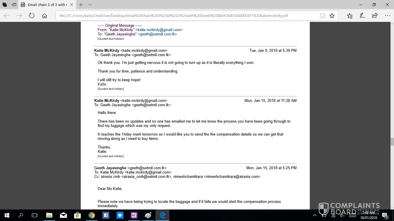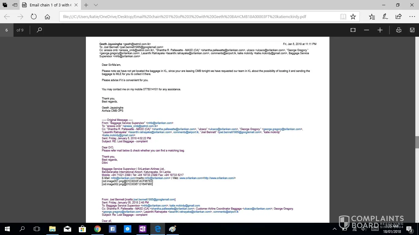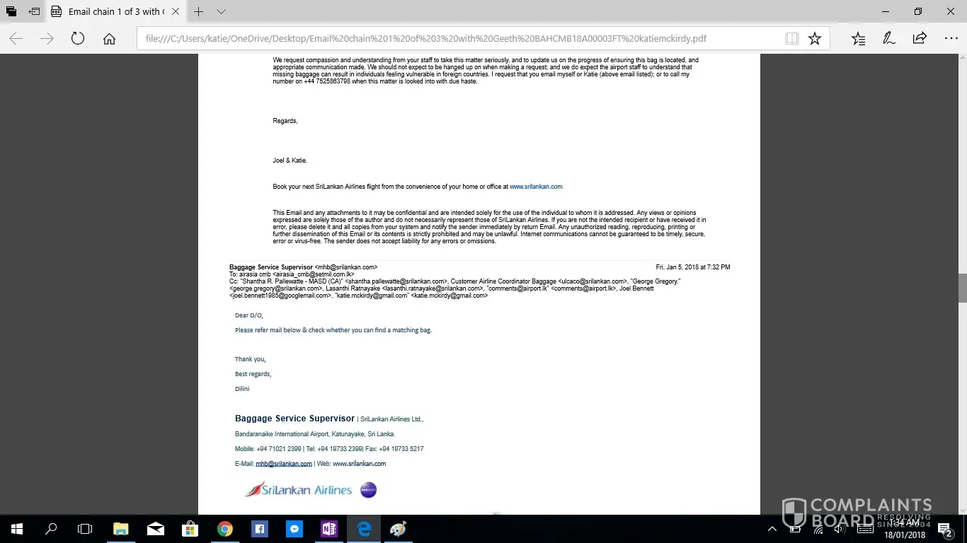 This is the second complaint i have registered, as the first was not acknowledged. If this is not taken seriously or with due haste i will be taking this to the small claims tribunal. I have been contacting Geeth at [protected]@setmail.lk complaint number BAHCMB18A00003FT, i requested repeatedly to be updated daily regarding my baggage search, however this was not done. There for i have had to contact Geeth repeatedly myself, due to lack of information in his emails stating replies such as "sorry for the delay" and "i will get back to you", he had not answered any of my queries, nor get back to me with any information. I would like you to acknowledge the serious impact of this baggage loss, I work as an artist and was relocating from NZ to AUS after my month travels, everything i own is in that bag. I have now lost all of the supplies for my career and been set back considerably. The cost of the items in this luggage far exceeded $4000 NZD. Secondly i was left travelling predominantly Muslim countries with no clothing including underwear and proper coverage. No compassion was given. No understanding was given. I was left feeling very vulerable without any support from your staff until i had to chase for a response. Due to staff saying my baggage would arrive soon i did not buy any other clothing for 12 days then had to out of necessity of travelling to a country in minus degrees.