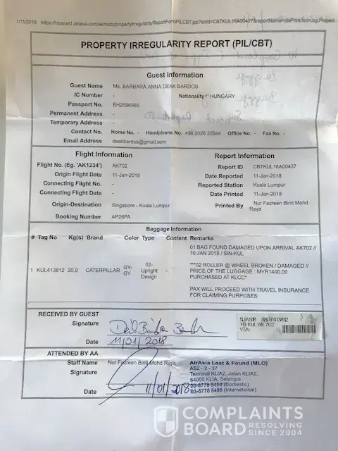 during our recent holiday in Asia (Thailand, Malaysia and Sinagpore) we were flying by AirAsia 5 times within 3 weeks with my husband. During one of our flight from Singapore to Kuala Lumpur (flight number AK702) on 11th January one of our baggage wheels was broken out. Upon our arrivel to KL and after we received our bagagge and realised the isseu we reported it at your service desk on the following report ID: CBTKUL18A00437. The trunk was brand new, we bought it in Kuala Lumpur KLCC plaza on the 21st December. It was a Caterpillar brand trunk with value of MYR1400. I kindly ask you to review our complaint based on the above information considering how many times we choosed your flights during our 3 weeks holiday and the having the brand new trunk which I can also proove by an invoice. In case of any questions please do not hesitate to cantact me on my email address: [protected]@gmail.com.