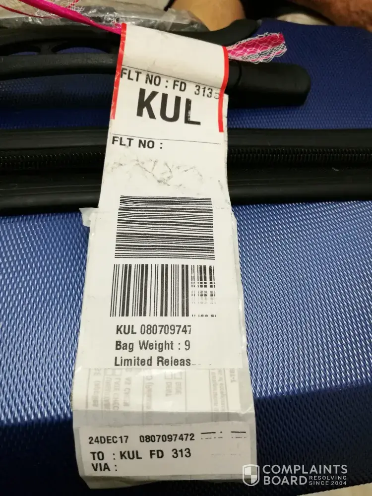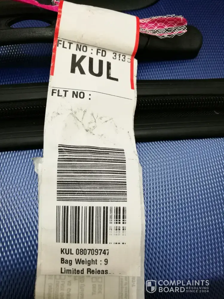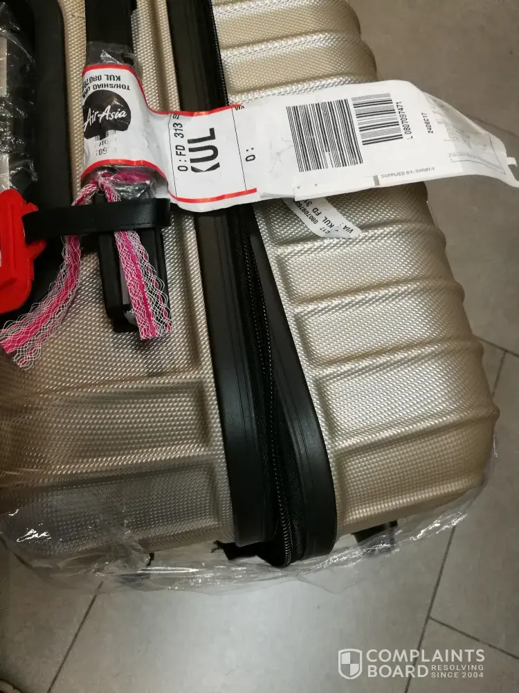 Immediately after that, we took the damaged bag to the air asia baggage reporting centre at klia2, to make an official complaint. no reason was given on how the damaged happened and, only that the staff there told us to open the damaged bag and to check if any belongings were missing or damaged. she also taken our report.in front of the staff, we checked, and nothing was missing but the bag was a total loss! very very disappointed with air asia, on the baggage handle part.
