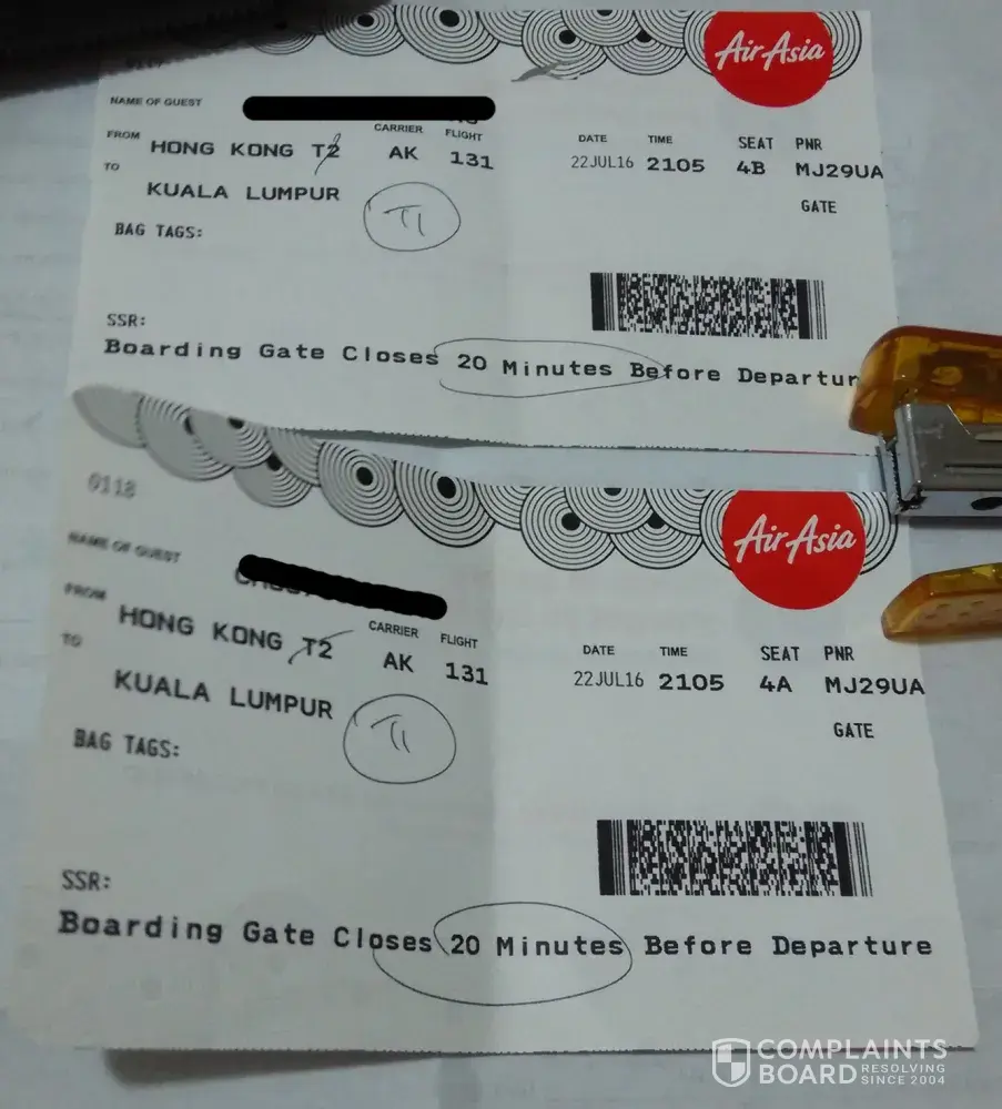 flight booking no: MJ29UA, flight no: AK 131 from Hong Kong to Malaysia on 22 July 2016.