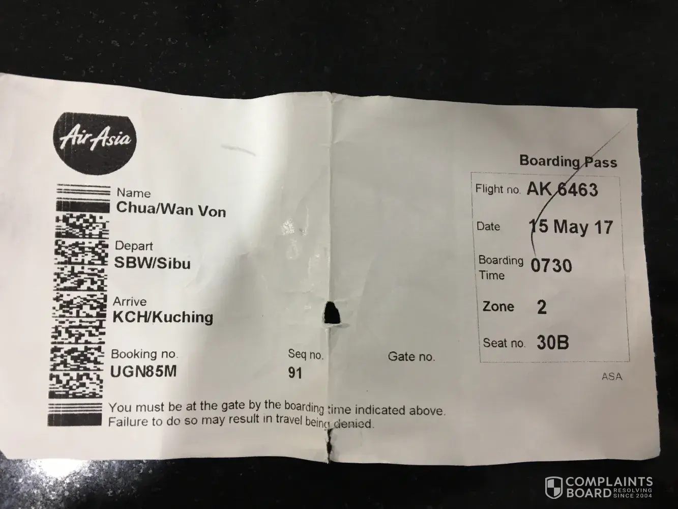 As attached is the boarding pass for Sibu - Kuching, which I've boarded and was told by by your staffs to get off the plane. For your info, this boarding pass I printed before boarding at Kota Kinabalu Airport.