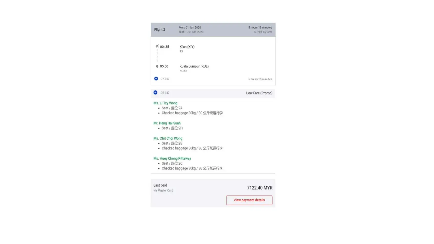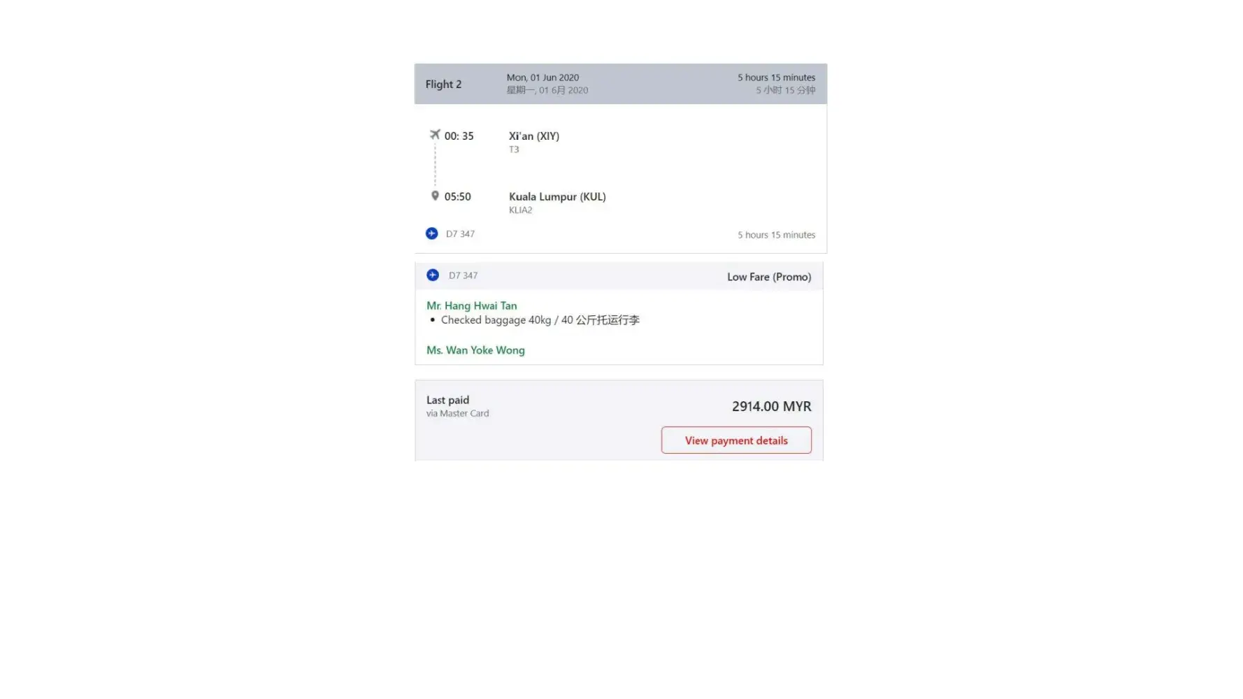 Flight references: V6HK2D-2 and V6HK2D ticket numbers