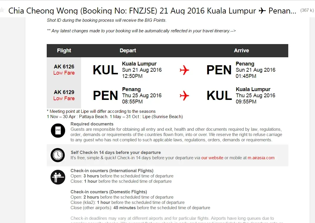 I just web check - in for my flight go & return to hat yai for (01/09/2016 - 03/09/2016, booking num: ic3zxs flight ak872 & ak873) & langkawi (04/09/2016 - 06/09/2016, booking num: md1kgc flight ak6317 & ak6316) on yesterday. (29/08/2016)
