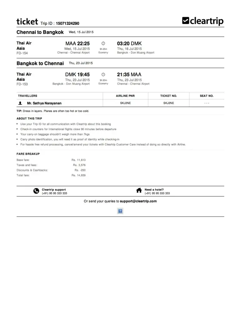 I had booked a ticket chennai - bangkok return booking (trip id [protected]) from cleartrip in the name of mr. sathya narayanan ticket no - skj2ne . due to my medical conditions i could not travel so my trip was cancelled.i was told by cleartrip that i would get a refund after detecting the charges of cancellation.but i didn't receive any refund or rescheduling yet. i have attached my medical certificate along with my air ticket details. it has been more than 4 months.