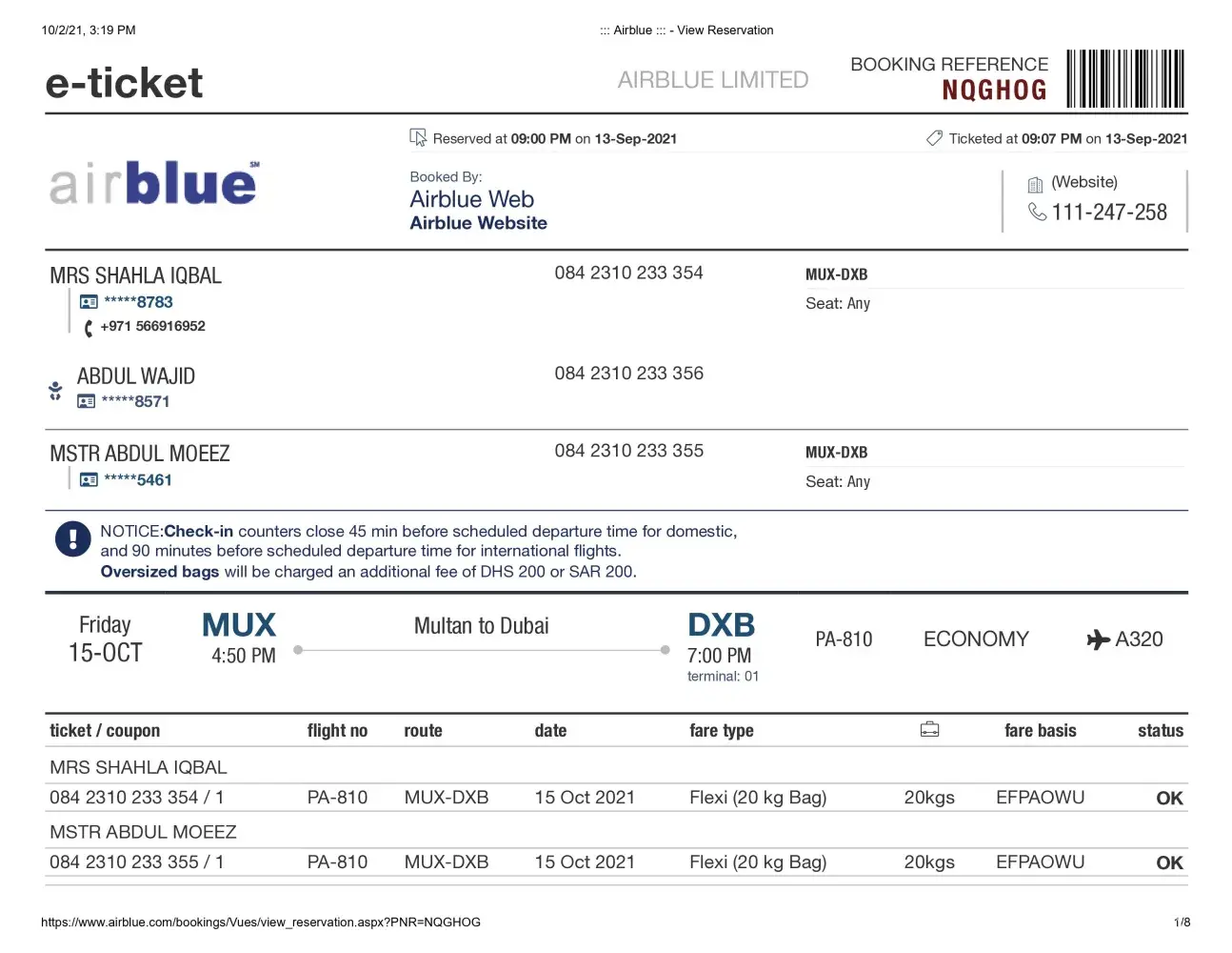 Desired outcome: Resume my family ticket back on 15th October 2021 Multan To Dubai, Flight already resume on 15th October 2021 multan to dubai