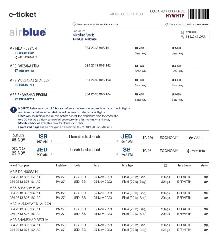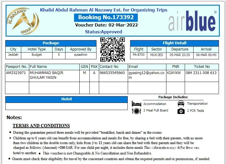 Team, Please be informed you that I booked flights and quarantine package with airblue airline for my family and they reached in jedda International Airport midnight 06-03-2022 When they immigration process completed they come outside they didn't found quarantine team due to government policy changed regarding quarantine they waited more then 3 hours after that I picked up by my self from Airport I requested to airblue quarantine team Please check with hotel team to refund my quarantine amount because my family suffered and didn't get services from the quarantine team there was package for my family for quarantine for 5 days + PCR test Plus transportation services there 2 passport I paid amount 1580 SAR but now they're making excuses searching new new excuses actually they didn't give services and they don't want refund my quarantine package amount which is against Saudi government low (article/617854), dear team kindly check my concern and force to airblue quarantine team to refund my amount 1580 SAR because they're ignoring my request as per Saudi government low all airline should refund quarantine package amount who landed after 5 march this flight laded 06-03-2022 and quarantine package is star from 06-03-2022 it mean airline should refund quarantine package amount all airline should follow the article/617854 because airblue is under CAA and GACA so kindly force the airblue airline let airblue airline force to the hotel for refund my quarantine amount Please check attached for proofs.