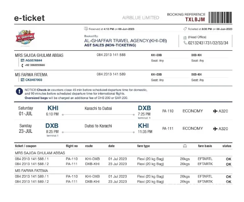 I booked my Ticket for my mother from ISB to Dubai for 12 February 2022 and return on 18 Feb ref RHMHAO
