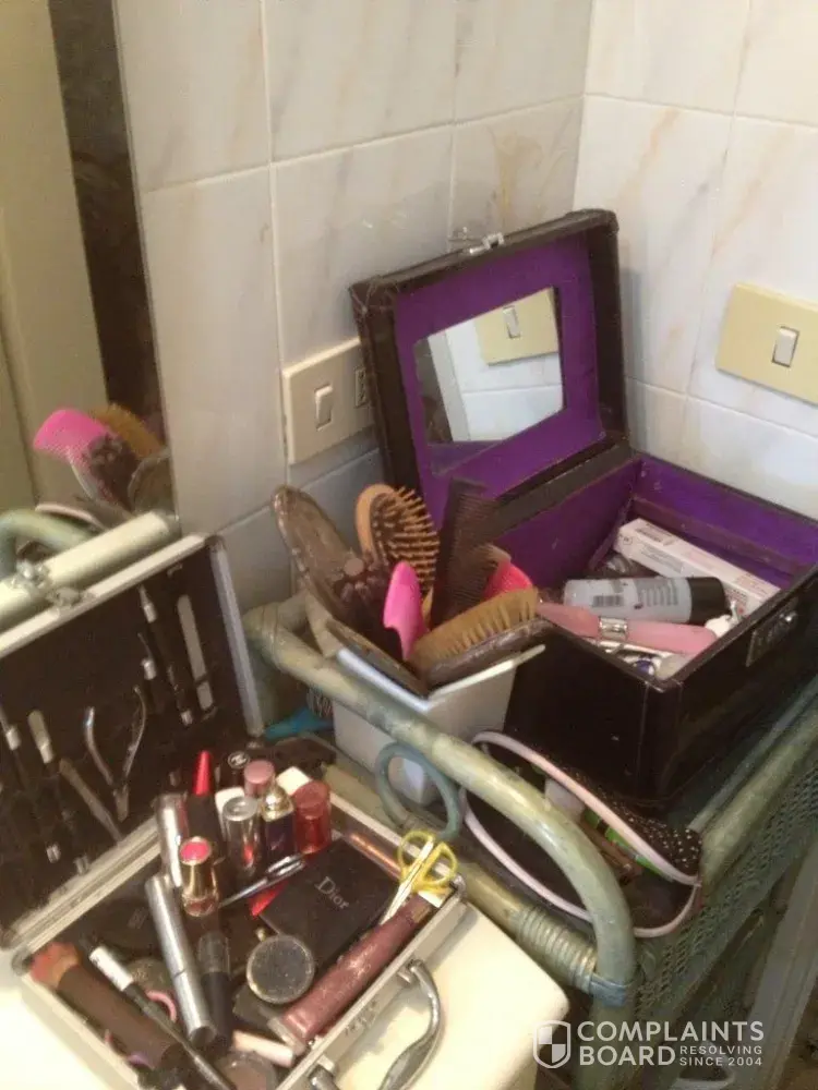 The bathroom is pitted out with the hosts nasty makeup supplies. Stains are dripping along the counters and on the mirrors. Look at the photos!