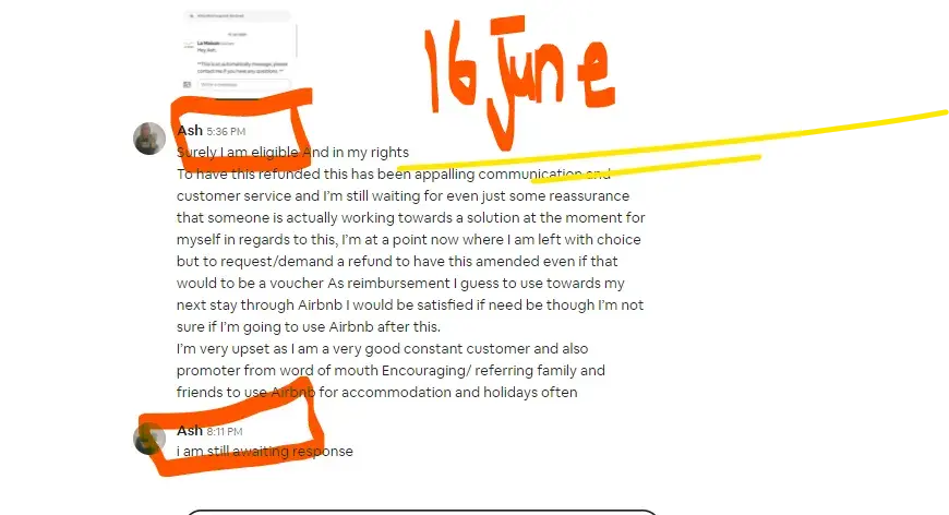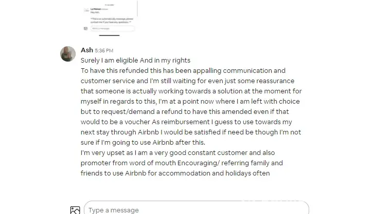 To have this refunded this has been appalling communication and customer service and I'm still waiting for even just some reassurance that someone is actually working towards a solution at the moment for myself in regards to this, I'm at a point now where I am left with choice but to request/demand a refund to have this amended even if that would to be a voucher As reimbursement I guess to use towards my next stay through Airbnb I would be satisfied if need be though I'm not sure if I'm going to use Airbnb after this.