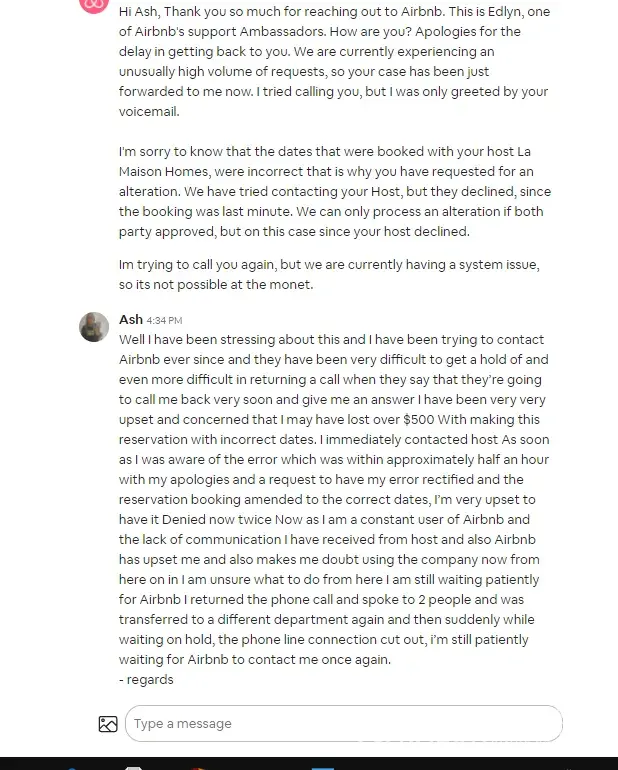 Hi Ash, Thank you so much for reaching out to Airbnb. This is Edlyn, one of Airbnb's support Ambassadors. How are you? Apologies for the delay in getting back to you. We are currently experiencing an unusually high volume of requests, so your case has been just forwarded to me now. I tried calling you, but I was only greeted by your voicemail.
