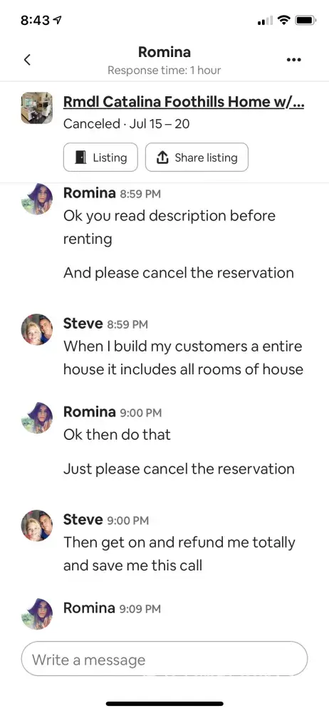 I booked a house because listing showed entire home. 5 minutes later I realized the listing was totally deceiving and last 4 words of desc of house said master bedroom wasn't included. I started conversation with host about it She then went on to tell me to cancel reservation, she told me that about 4 times. But now y'all are only wanting to give me a refund for less than half the booking. It's obvious the listing is deceiving and everyone I showed the listing too also agrees including my attorney. So I want to know how we are going to resolve this issue. I spoke with customer support and have gotten no where even sending them messages where host told me to cancel on numerous times