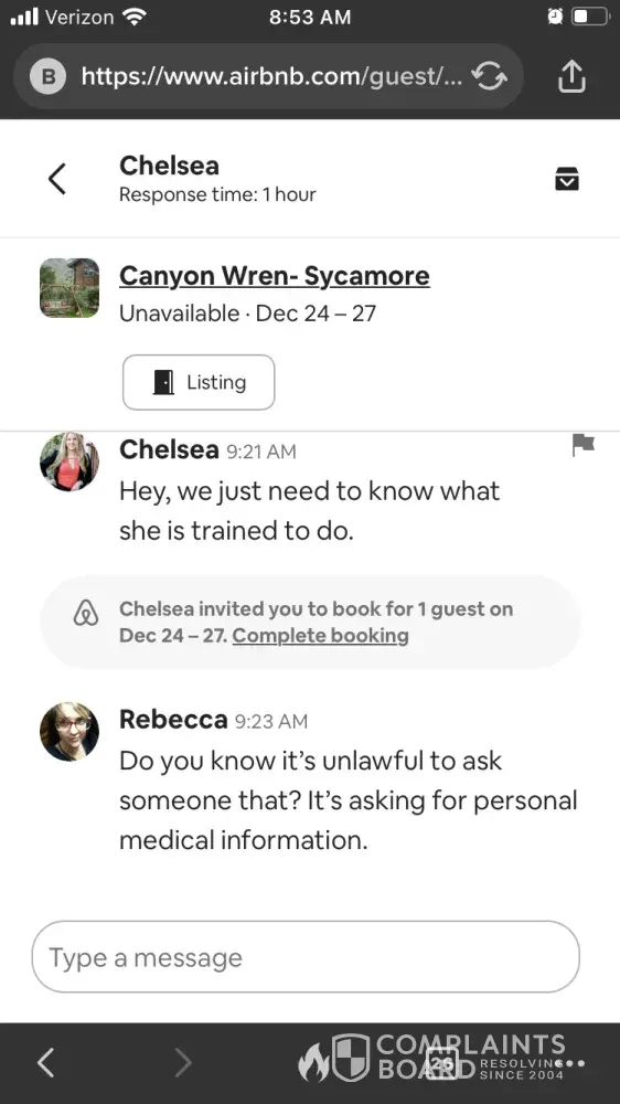 This host then asked me what service my animal provides. I told her that is my private medical information. She did not reply but instead made her place unavailable to me. This is pure discrimination, and isn't right.