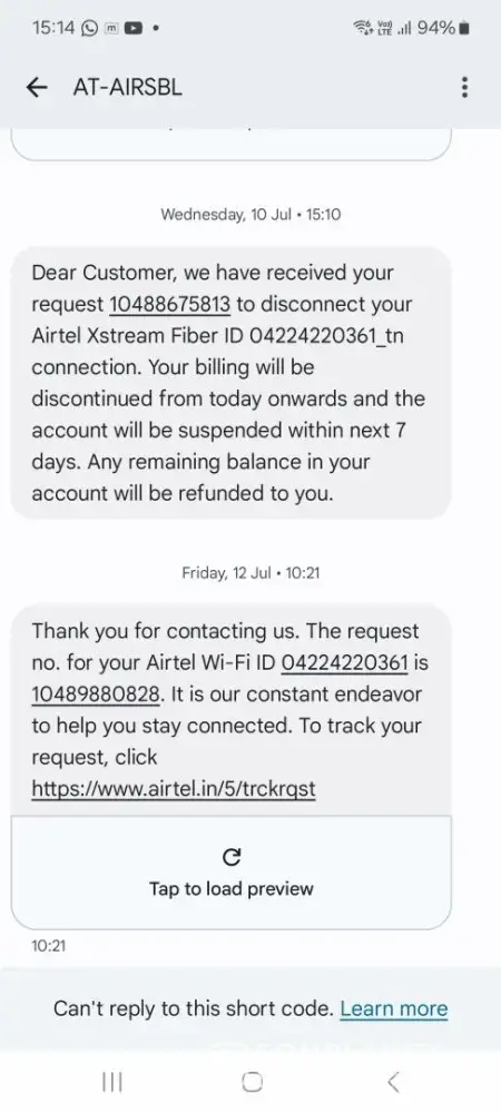 On my return from abroad on 02 July 2024, I found that the Airtel broadband was not working and I called Customer Care to complain. Inspite of repeated reminders, the complaint was not rectified and on 05 July, I called Customer Care to disconnect my broadband. When no action was taken till 10 July, I sent an email to Customer Care and I got a confirmation via email and sms that it is being disconnected wef 10 July. I got a shock in August when I saw that I had been billed for the full month service and not pro rata. When I sent an email asking for clarification and reason for not disconnecting, they replied that the connection is being disconnected only from 12 August 2024. Inspite of repeated emails to Customer Care and even the appellate authority, I get a standard computer generated reply that my disconnection request is being processed from.12 August. This is inspite their own earlier correspondence confirming disconnection wef 10 July. To add to the injury of not acting inspite repeated reminders, they have added the insult of billing me for services not provided. This is inspite my being a customer for more than 15 years. I am.shocked by the utter lack of response and inefficiency of Customer Care and the appellate authority which appears to be a sham. Do not ever take an Airtel Broadband Connection.