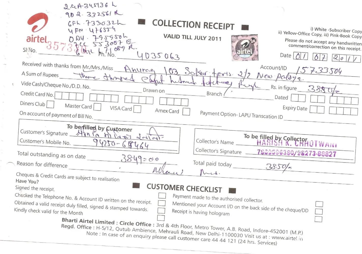 I have two airtel connection in Indore one is 0731+4035063 i have paide 3849/- Rs.by receipt no. 357330, dt.1/7/11 in advance f0r 5 months payment for un limited internet use and 1 month extended free internet rent there for for 6 month, but from 1 st month i am receiving bill to pay more amount, even i have made 2 complaints, but my airtel land line phone is also disconnected, i cant make call from 3 months my complaint no. is 2331858 and 4925794, all resposible oficer of airtell told me we are solving your problem but they are not doing same, they are avoiding to solve my problem because they know they have my advance payment i cant do any thing.